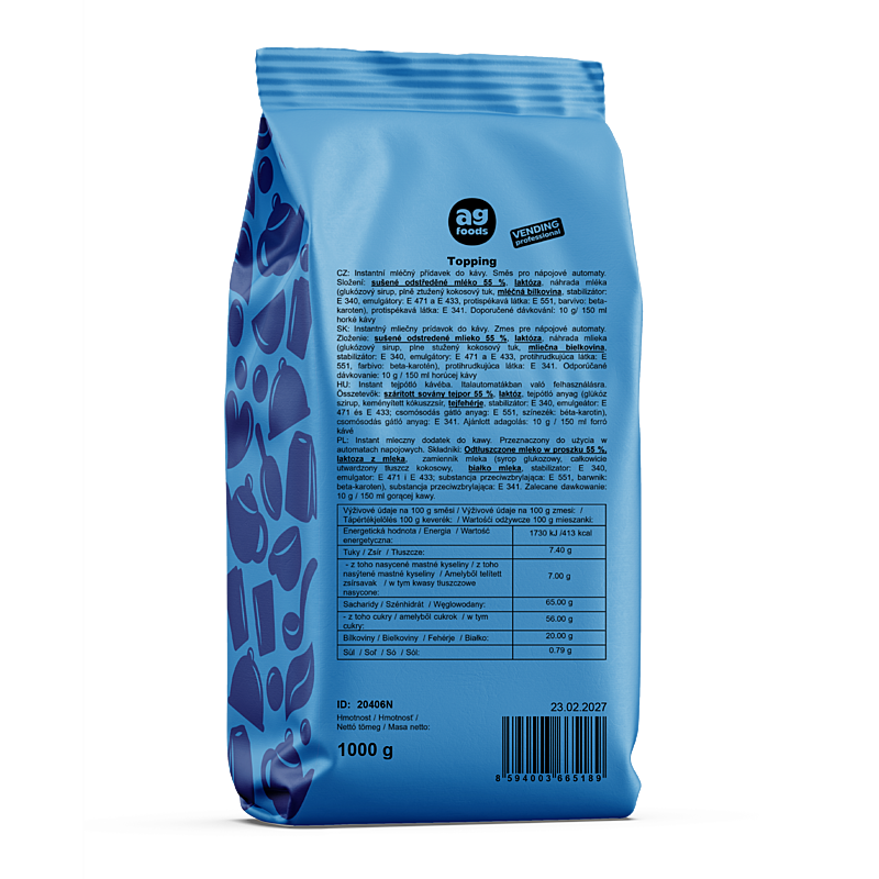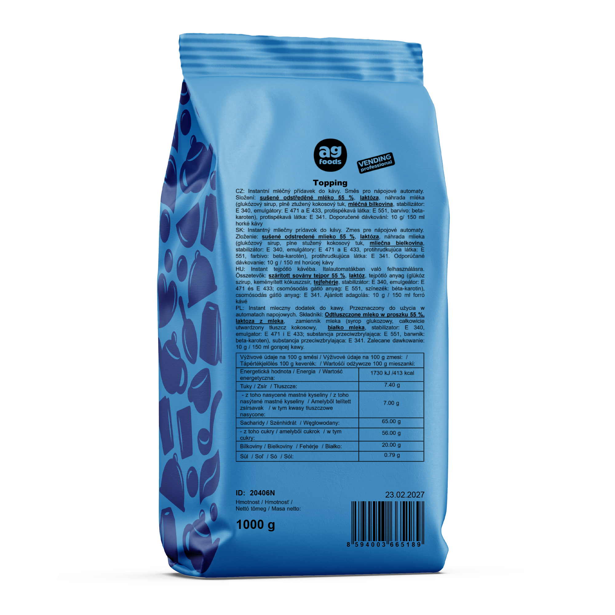 Stabilna pianka mleczna, która podniesie każdy gorący napój na profesjonalny poziom. Mieszanka AG PRO Topping została opracowana z myślą o niezawodnym tworzeniu bogatej i długotrwałej pianki dzięki wysokiej zawartości mleka i doskonałej rozpuszczalności. W rezultacie uzyskuje się delikatną, kremową konsystencję, która doskonale uzupełnia kawę, cappuccino, latte i napoje czekoladowe. Dzięki stałej wydajności topping jest idealny do automatów sprzedających, biur, hoteli, kawiarni, stołówek i innych lokali gastronomicznych, gdzie kładzie się nacisk na jakość, prostotę przygotowania i jednolity efekt w każdej filiżance.