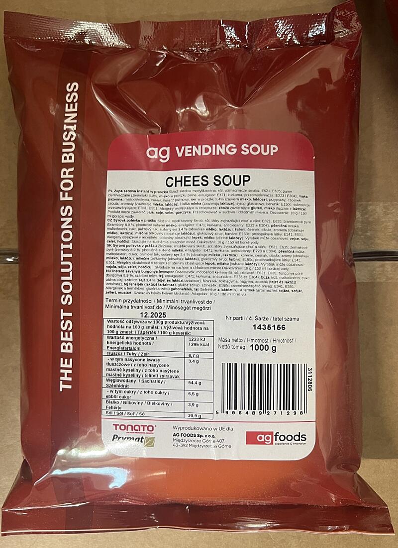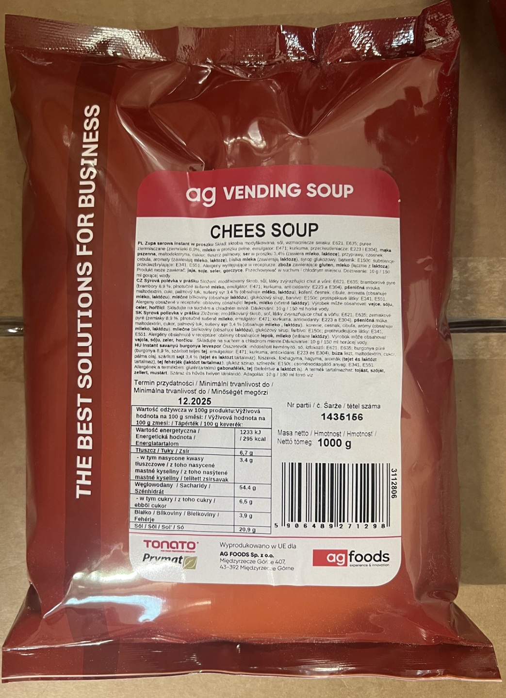 AG Vending Soup - serowa zupa instant 1000g , zupa jest przeznaczona głównie do segmentu vendingu, ma charakterystyczny smak i wysoką jakość. Starannie skomponowany skład zapewnia doskonałą jakość oraz wyborny aromat i bukiet smakowy. Bardzo dobra rozpuszczalność, stabilna gęstość nasypowa, nie zbryla się w automatach.